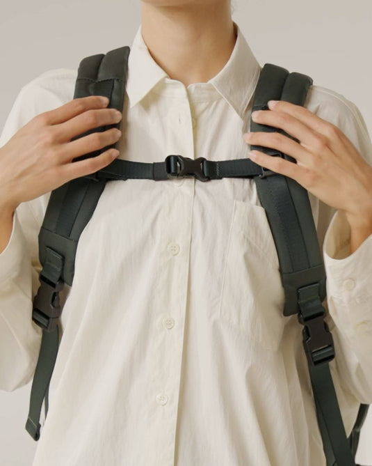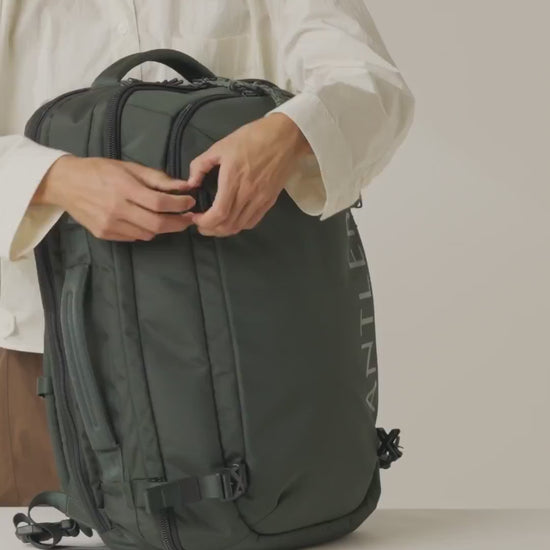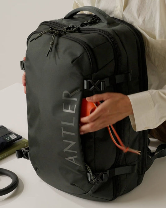 Made with durable, water-repellent recycled fabrics, it matches the capacity of a cabin suitcase but in a flexible backpack form. Full side opening with compression straps makes packing easy and organised, while a padded laptop sleeve fits even the largest laptops. Built for comfort in motion, fully adjustable back straps and a chest strap offer extra support when carrying heavier loads. The large front drop pocket and handy quick-access side pockets offer plenty of convenient space for essentials, plus hidden compartments to tuck straps away neatly when not in use.