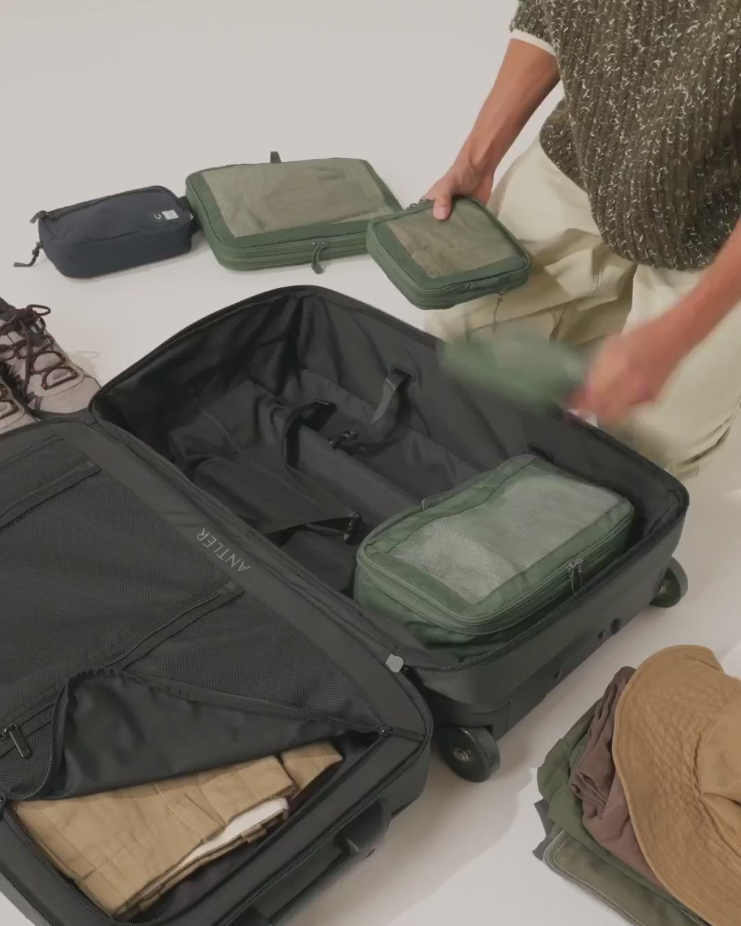 The durable hard shell back resists scuffs and scratches, while the water-repellent, recycled fabric front flexes for easy packing. Compression straps and adjustable buckles keep things tight and secure, and side handles make it easy to grab and stow at a moment’s notice.