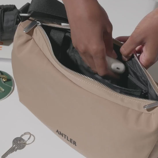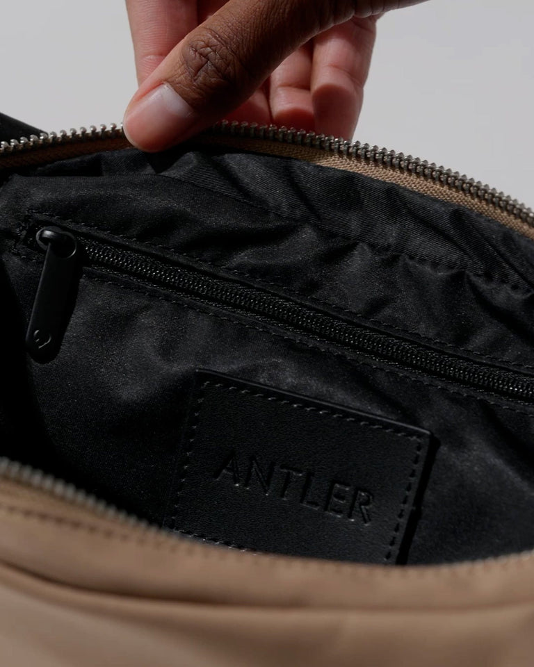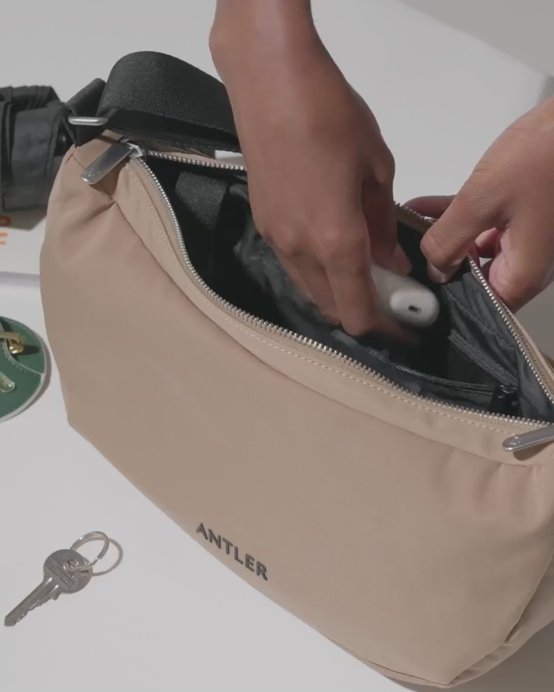 Made from 100% recycled, water-resistant fabric, the compact design fits more than you’d think and provides light protection from the elements. Internal pockets keep everything in its place, while the adjustable strap lets you wear it how you like – slung across the body for active days, or on your shoulder for something more refined.